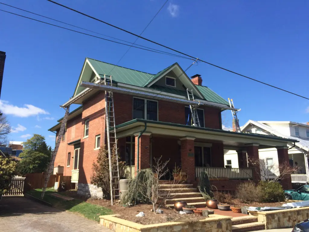 Another old fashioned standing seam metal roof installation taking place in Harrisonburg! As soon as the roof is finished we will be installing 6″ coppertone half-round seamless (yes, you read right, seamless half-round) guttering all around! It will be a beautiful combination. Stay posted for more pictures!